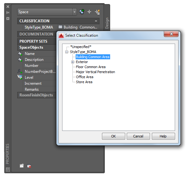 If you have generated a space that has its boundaries calculated by an area calculation standard, you may need to classify the space according to the selected standard, in order to provide the standard with the necessary information to calculate the boundaries. For example, the BOMA standard requires classifying spaces according to their space type, as the space type is relevant for determining boundary offsets.