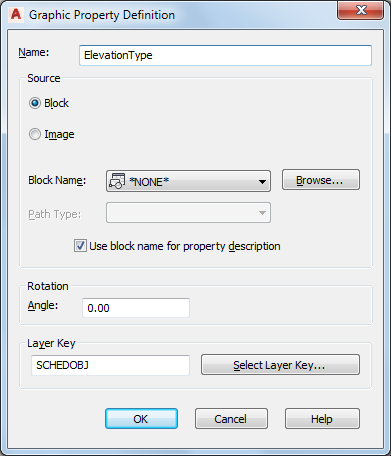 Use this procedure to add a graphic property definition to a property set definition. Graphic property values can be blocks in the current drawing or image files, such as BMP, GIF, JPG, PNG, or TIF. The image displayed cannot be edited directly.