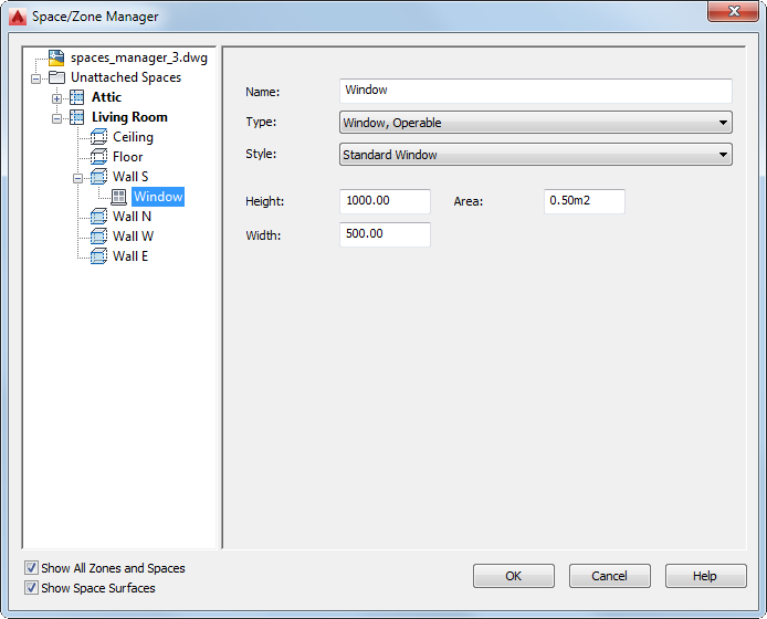 | change the area of a surface opening | enter values for Area, Height, or Width of the opening. Note: For a 3D freeform space opening, you cannot edit the height or width on this worksheet. You can change the width and height of a 3D freeform surface opening using grips.