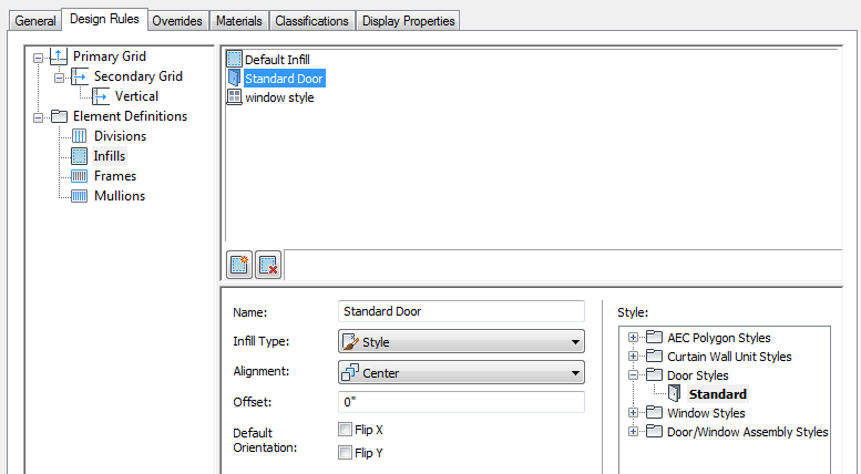 Use this procedure to modify existing elements in a curtain wall style. A curtain wall consists of division, infill, frame and mullion elements, all of which are defined in the design rules of the curtain wall style.
