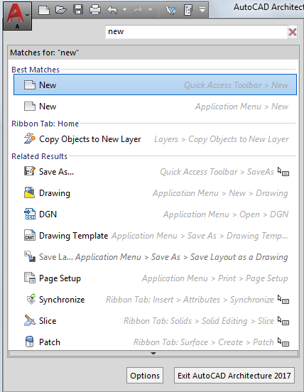 In the application menu, you can search for a command and then select it from the list of matches. Search results are retrieved from the following locations: