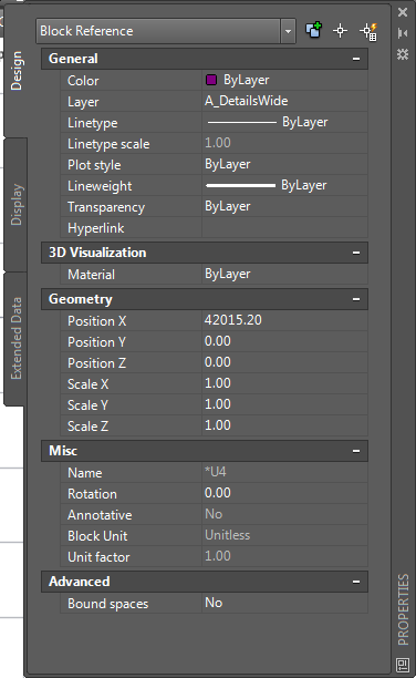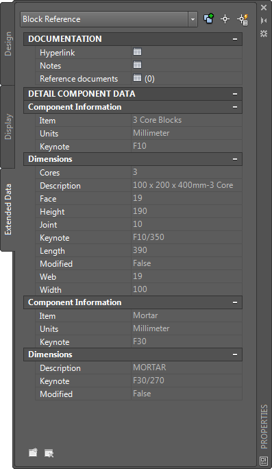 The following image shows the Extended Data tab of the Properties palette for a concrete masonry unit detail block.