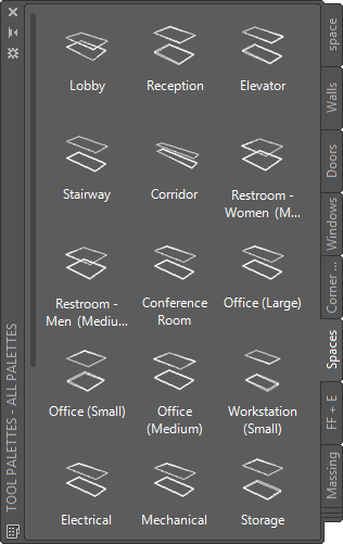 Custom palettes created by your CAD manager or other users may also contain space tools with space styles and properties that are customized for your projects or office standards.