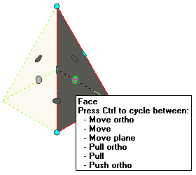 | move the face freely while stretching adjacent faces | click and hold the Face grip, press Ctrl once, and specify the new Face location. | Move face freely, stretch adjacent faces |