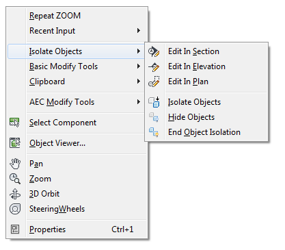 If more than one type of object is selected, the context menu includes only those commands that can be applied to all the selected objects. Likewise, the ribbon displays a Multiple Objects contextual tab that contains only the applicable commands. If no objects are selected, the general context menu is displayed as shown below. This menu contains non-object-specific commands.
