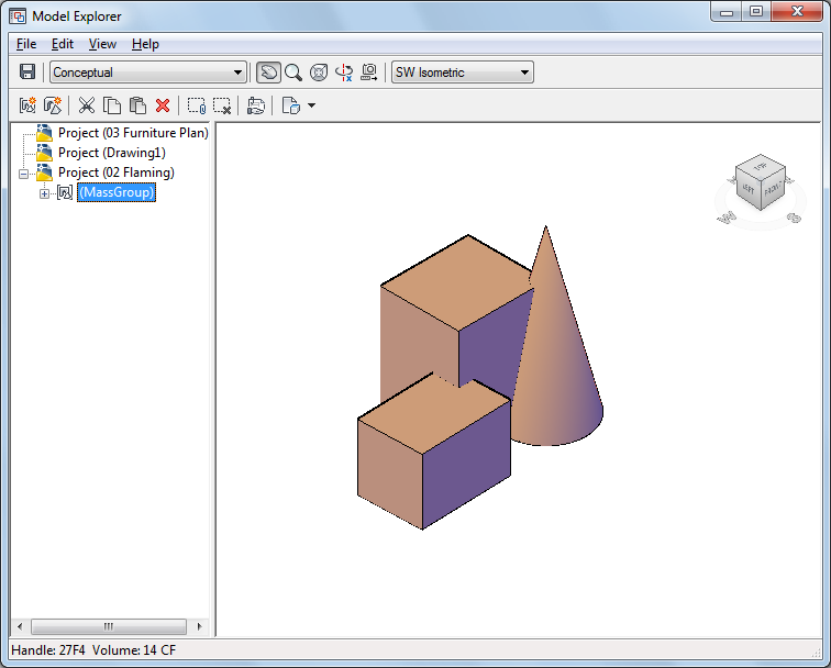 The Model Explorer is a window in which you create, view, and manipulate mass elements and mass groups. You can create your entire conceptual model by using the Model Explorer. The main window is similar to the 3D orbit view. You can attach objects and mass elements to mass groups and view them in the Model Explorer. You can simultaneously view the conceptual and the hierarchical structure of mass groups and mass elements that make up the model.
