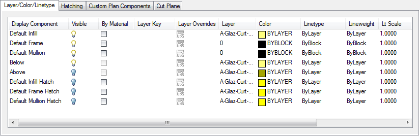 Use this procedure to specify the properties of one or more cut planes for a curtain wall unit style. Cut plane display properties apply only to display representations, such as Plan, that are used in Top view (Plan view) of a drawing.