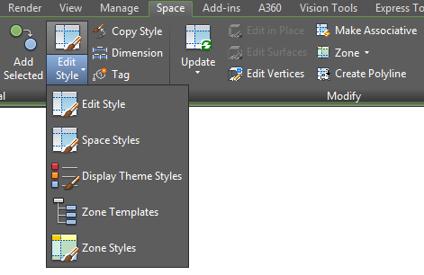 Depending on the object you have selected, you may be able to access not only styles for that object, but also styles of objects that act as supporting objects. For example, when you have selected a space, you can access space styles, zone styles, zone templates, and display theme styles.