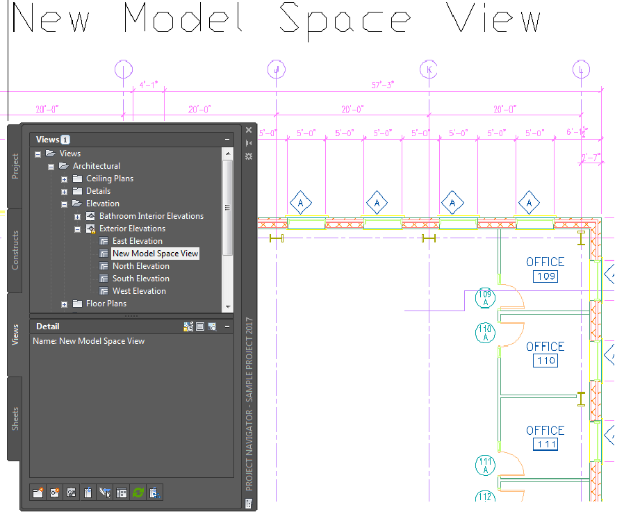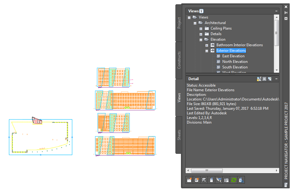 You create a view drawing by selecting constructs from the Project Navigator palette and referencing them into the view drawing. When you are creating multi-level views, each construct is referenced at its relative level height, with the lowest level inserted at Z = 0.
