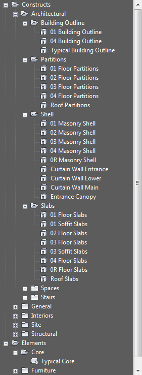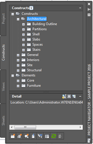 The Drawing Explorer is a tree view common to the Constructs, View, and Sheets tabs of the Project Navigator. This is where the drawing files are organized. Each tab of the Project Navigator except the Project tab has a Drawing Explorer tree where the associated project drawing files—elements, constructs, views, and sheets—are displayed.
