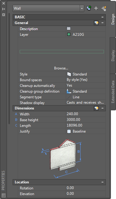 The Properties palette provides a central location to view and modify both the physical and graphical properties of an object. The object can be one you are about to draw, or one that is already selected in the drawing area. Using the Extended Data tab of the Properties palette, you can also attach other kinds of information to an object, such as classifications, notes, reference documents, hyperlinks, and property set data. You typically keep the Properties palette open during an AutoCAD Architecture session.