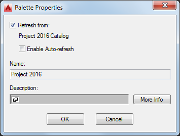 If you select Enable Auto-Refresh, each time you start the software, any linked tool palettes will be updated to reflect any changes made to the tool palette and its contents in the tool catalog.