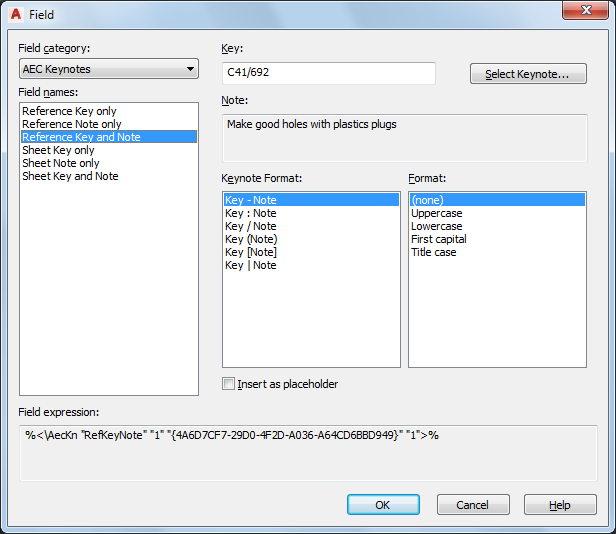 | insert a keynote field into a text element | see To Insert Fields in AutoCAD Text. |