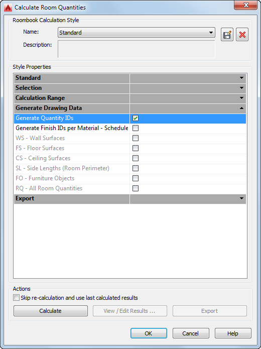 In the Calculate Room Quantities dialog box, under Style Properties, Generate Drawing Data list, select Generate Quantity IDs.