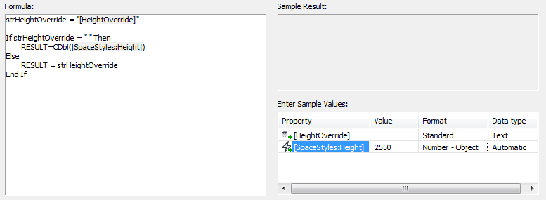 Sample values are formatted and inserted into the formula in place of the corresponding property definition names with brackets surrounding them. The entire sample formula is evaluated, and the result displays in the Sample Result pane.