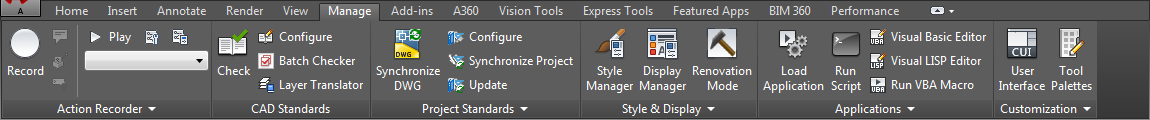 - Project Standards. Contains commands associated with project standards for an AEC project. You can configure project standards, synchronize the project with its standards, synchronize standards with each other, and audit projects and drawings.