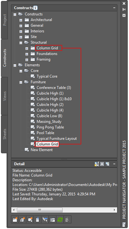 You may create a construct, and then realize that this is actually a repeating element. For example, you might create a column grid and then decide to use it on another floor. You can easily convert the construct to an element and reference it into multiple constructs.