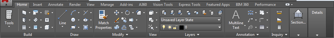 The Home tab contains the most frequently used commands within the software. Basic object and drawing tools can be found here, as well as frequently used utilities like modification tools, layers, and basic annotation.