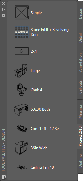 To use a tool catalog item in AutoCAD Architecture, drag the item into the software’s workspace. Dragging a tool palette into the workspace adds the tool palette to the default tool palette set.