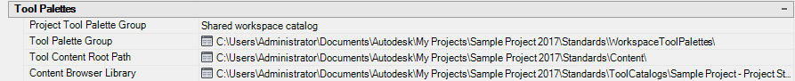 If you select Shared Workspace Catalog, the path selected for Tool Palette Group is added to your project profile (AWS), and the tool catalog is accessed from the specified location. If you select Per User Workspace Catalog, a folder is created under C:\My Documents\Autodesk\My Projects\<project name> and the tool palettes are copied to that folder. If you select None, the project tool palette group is disabled for this project, and the other properties under Tool Palettes do not display.