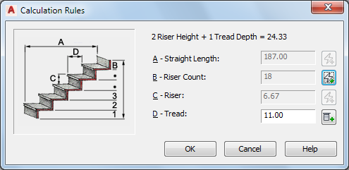 Some of the interacting dimensions can be user-defined and some are automatic, depending upon the combination of fields that are selected. Only logical combinations are available when the rule-based calculator is in effect. When the rule-based calculator is not in effect, either tread or straight length can be user-defined and either riser count or riser height can be user-defined.