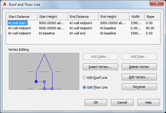 The table at the top displays information about each vertex in the curtain wall. You can select a vertex to edit from the list.
