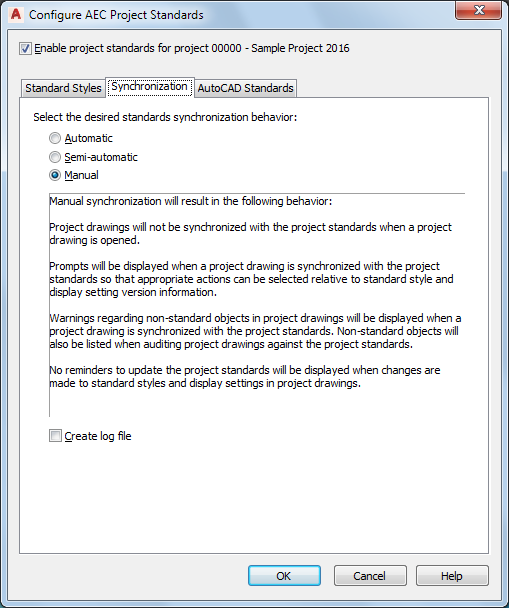 Note: The synchronization settings you define are relevant only for the synchronization of the AEC standard styles and display settings in a project. They do not affect the synchronization of AutoCAD standards in a project. The settings in this dialog box control only how project drawings are synchronized with project standards drawings. They do not specify how project standards drawings are synchronized with each other.