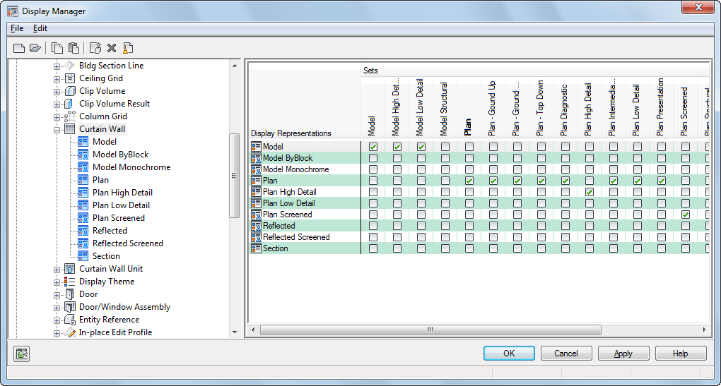 In the right pane, rows list the display representations that exist for that object, and columns list display sets. A check mark under a display set indicates that the display representation is used in that display set. A display representation can be used in multiple display sets.