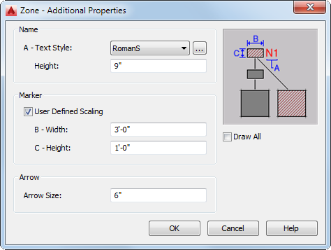 Use this procedure to specify the text style, zone marker size, and zone connection line arrow for a selected zone. You can also specify whether the zone hatch is used only for directly attached spaces of for those attached through subzones as well.