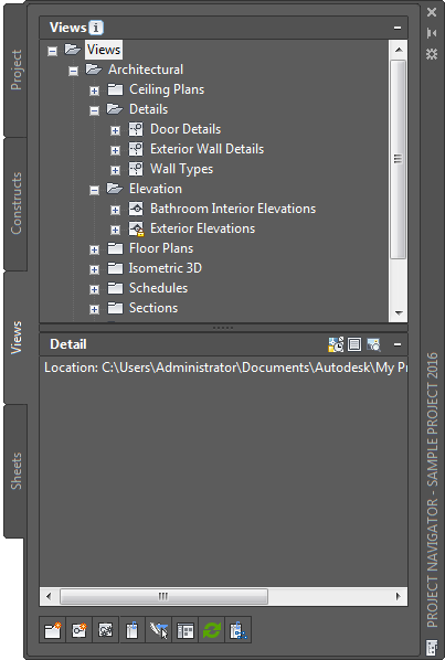 The Views tab of the Project Navigator palette is where you create individual views of your building data. Views contain constructs and are the primary location for adding annotation like notes, tags, and dimensions within the project. After you have created a view drawing, you can create model space views in it.