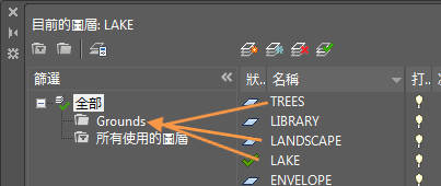 在此範例中,我建立一個稱為 Grounds 的圖層群組篩選,並將 TREES、LANDSCAPE 和 LAKE 圖層拖曳到群組篩選。
