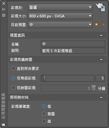 - 依時間彩現。 指定彩現引擎用來反覆精細化彩現影像的分鐘數。(RENDERTIME 系統變數)