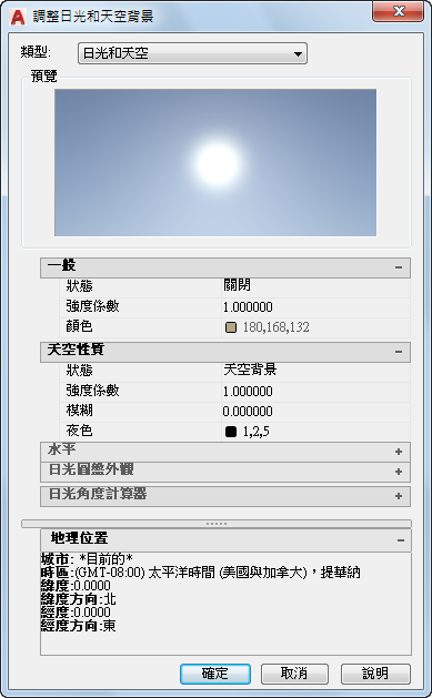 顯示目前的日光和天空設定對目前的視圖的影響。