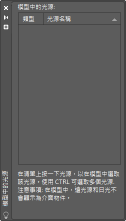 「類型」欄中的圖示可指示光源的類型:點光源、聚光燈,或遠光源,並可指示該光源是打開的還是關閉的。在清單中選取光源,以在圖面中選取它。若要排序清單,請按一下「類型」或「名稱」欄標頭。