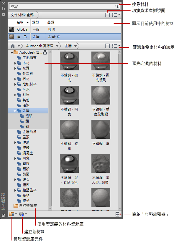 - Autodesk 資源庫。包含預先定義材料,適用於支援該材料的 Autodesk 應用程式。雖然您無法編輯 Autodesk 資源庫,但可以將這些材料當做自訂材料的基礎,然後再儲存於使用者資源庫。