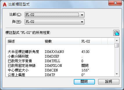 顯示標註型式的比較結果。如果您比較兩個不同的型式,則會顯示其不同的性質。如果將第二個型式設定為 <無> 或與第一個型式相同的型式,則會顯示該標註型式的所有性質。