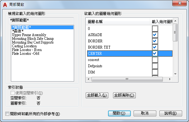 開啟圖面時,卸載所有外部參考。選取此選項可提高開啟過程。如果您局部開啟某個含有連結外部參考的圖檔,則只有載入的外部參考部分 (選取的視圖所定義) 會連結到局部開啟的圖面中。