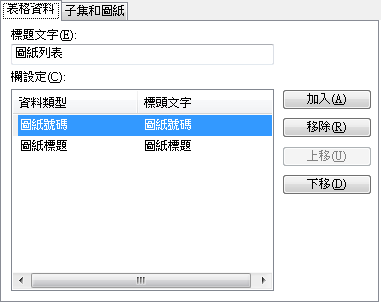 在圖紙列表中顯示欄定義清單。清單中的每一行都代表一個欄。由上到下的清單順序表示欄在表格中顯示的方式 (從左到右)。