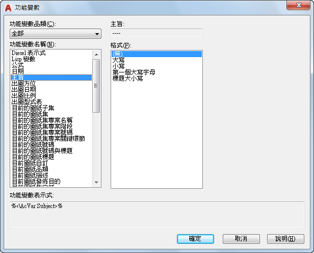 列示顯示功能變數值的選項。例如,日期功能變數可以顯示或不顯示日期名稱,並且字串可以是大寫、小寫、第一個大寫字母或標題大小寫。「功能變數」對話方塊中顯示的值將反映選取的格式。