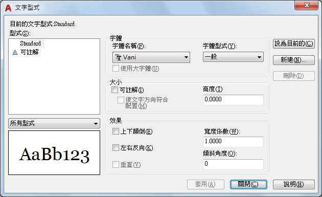 指定字體字元的格式,如斜體、粗體或標準。如果選取「使用大字體」,此選項變成「大字體」名稱,且可用來選取「大字體」檔名。