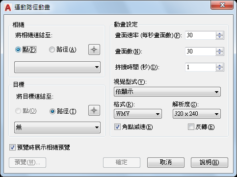 顯示視埠中相機移動的動畫。如果選取了「預覽時展示相機預覽」,則「動畫預覽」對話方塊也會顯示動畫的預覽。