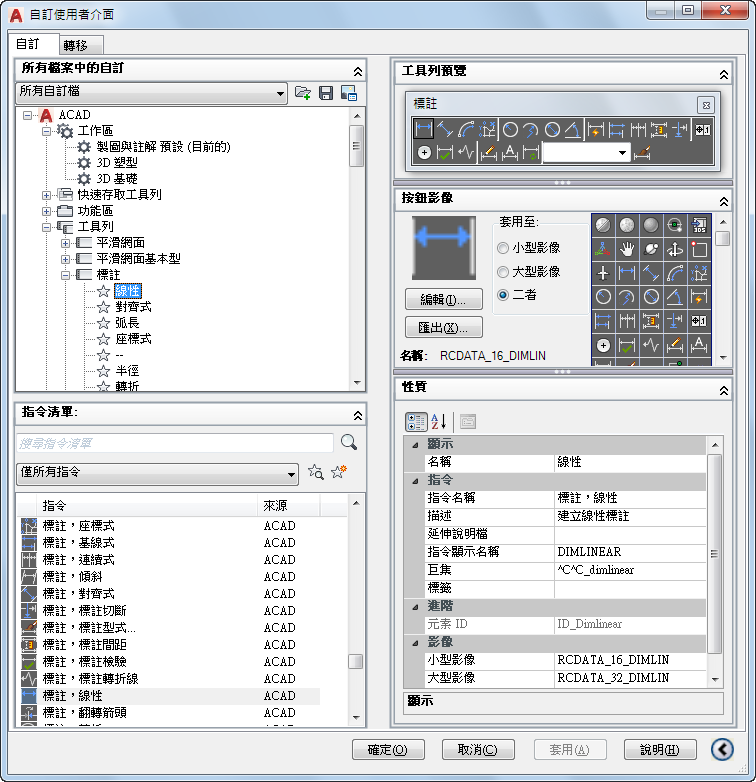 - 大影像 - 指定將指令加入至工具列或功能區面板時要使用的大影像檔。