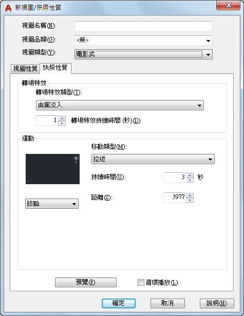 當具名視圖指定「電影式」視圖類型時,設定用於具名視圖的移動的類型。