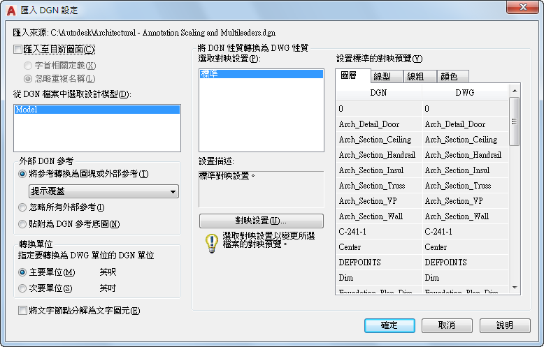 標準為預設對映設置,其從正匯出的圖面中萃取資料並將自動對映套用至 DGN 圖層、線型、線粗和顏色,如對映預覽所示。
