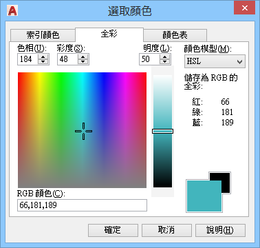 透過「色相」、「彩度」、「明度」(HSL) 顏色模型或「紅」、「綠」、「藍」(RGB) 顏色模型來指定使用全彩 (24 位元顏色) 的顏色設定。使用全彩功能時,可以使用一千六百多萬種顏色。「全彩」頁籤中的可用選項取決於指定的顏色模型 (HSL 或 RGB)。