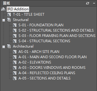 - 圖紙子集通常與某種訓練 (如建築或機械設計) 相關聯。例如,在建築上,您可以使用名為「結構」的子集;在機械設計上,可以使用名為「標準扣件」的子集。在某些情況下,您也可能會發現建立與審閱或完成狀態相關聯的子集很有用。您可以依需要將子集以巢狀方式放置在其它子集中。建立或匯入圖紙或子集後,您可以在樹狀檢視中拖曳,對其重新排序。