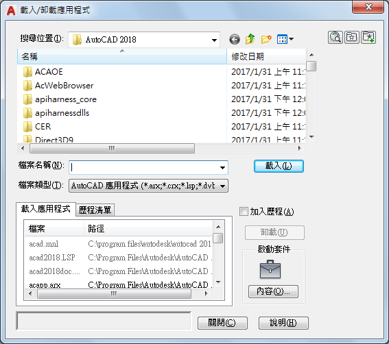 如果您選取已載入的檔案,「載入」會在適當時機重新載入應用程式。但 ObjectARX 應用程式不能重新載入。在此情況下,您必須先卸載 ObjectARX 應用程式,再重新載入。您也可以用指向設備右鍵按一下「歷程清單」頁籤中的檔案,從快顯功能表選取「載入」選項。