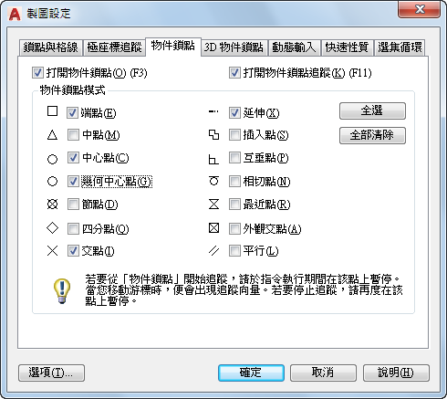 使用常駐式物件鎖點設定 (也稱為常駐物件鎖點),您可以在物件上的精確位置指定一個鎖點。按 Tab 可循環選擇選項。