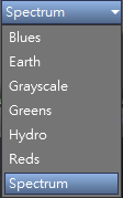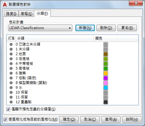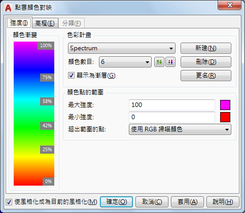 按一下「點雲」頁籤 「視覺化」面板 色彩計畫圖示列,選擇以下其中一個色彩計畫。預設為光譜。