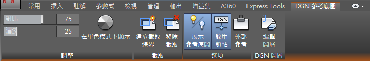 選取圖面中的 DGN 參考底圖時,功能區上會顯示「DGN 參考底圖」關聯式頁籤。